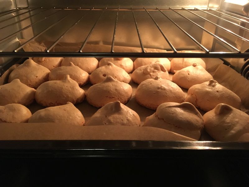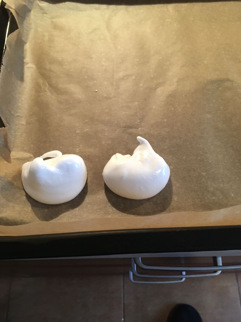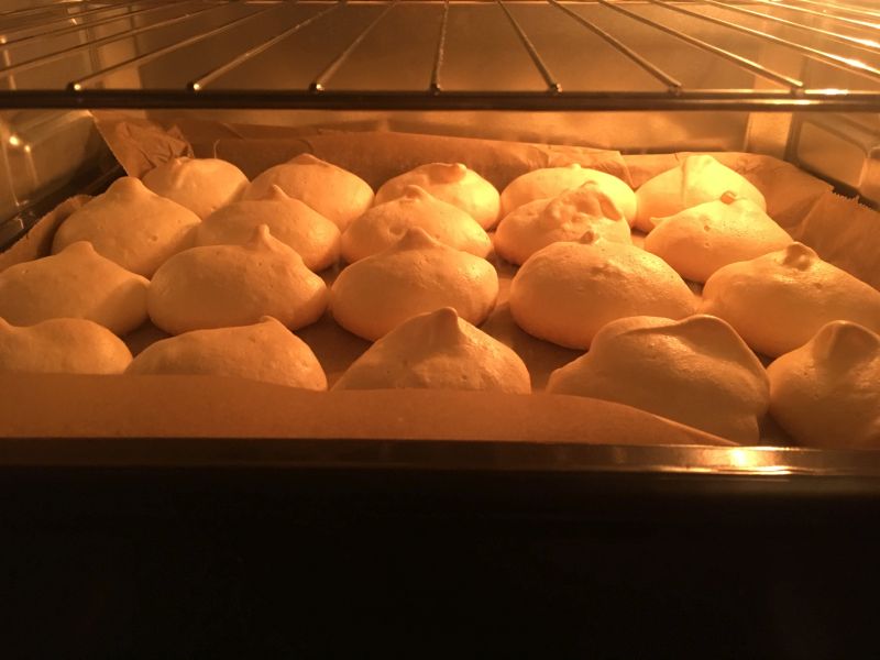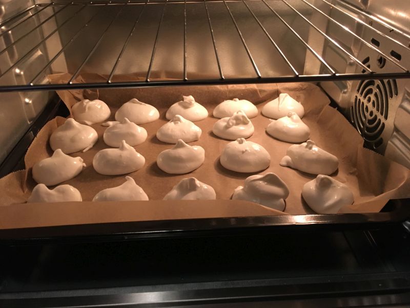 Get baking form and put small meringues on it with spoon. In background warm up oven up to around 130°C-140°C.